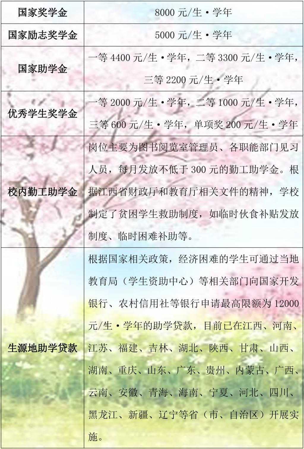 根据国家规定,学生入学须交纳学费、住宿费、书本费等费用。学校严格执行江西省发改委、省财政厅、省教育厅有关文件核定的收费标准,医学类专业学费为4350元/生·学年,保险学、市场营销、公共事业管理专业学费为3880元/生·学年;住宿收费标准:六人间为800元/生·学年,四人间为1000元/生·学年。在新生入学报到前,如相关部门核准新的收费标准,则按新标准执行。