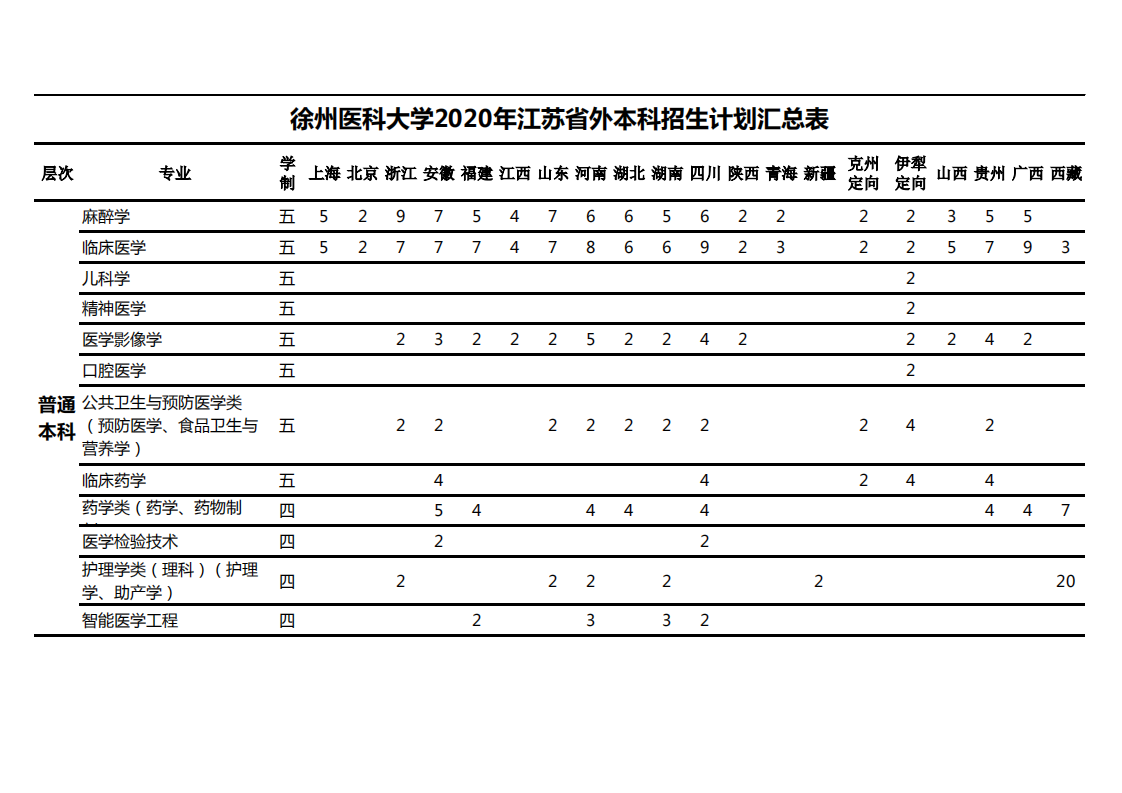 徐州医科大学2020年江苏省外本科招生计划汇总表