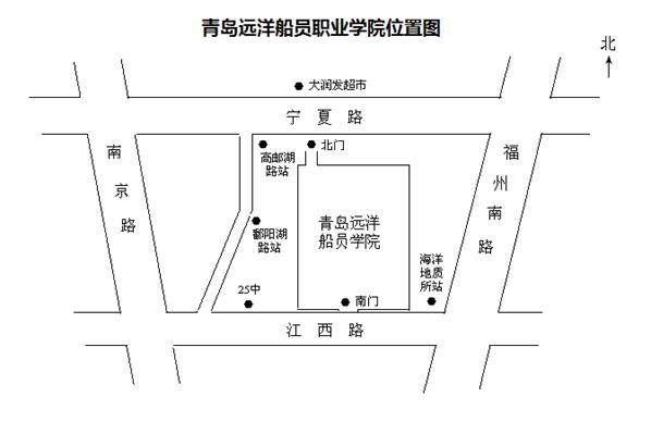 青岛远洋船员职业学院位于青岛市市南区江西路84号(南门)或青岛市市南区宁夏路201号(北门),乘车路线:
