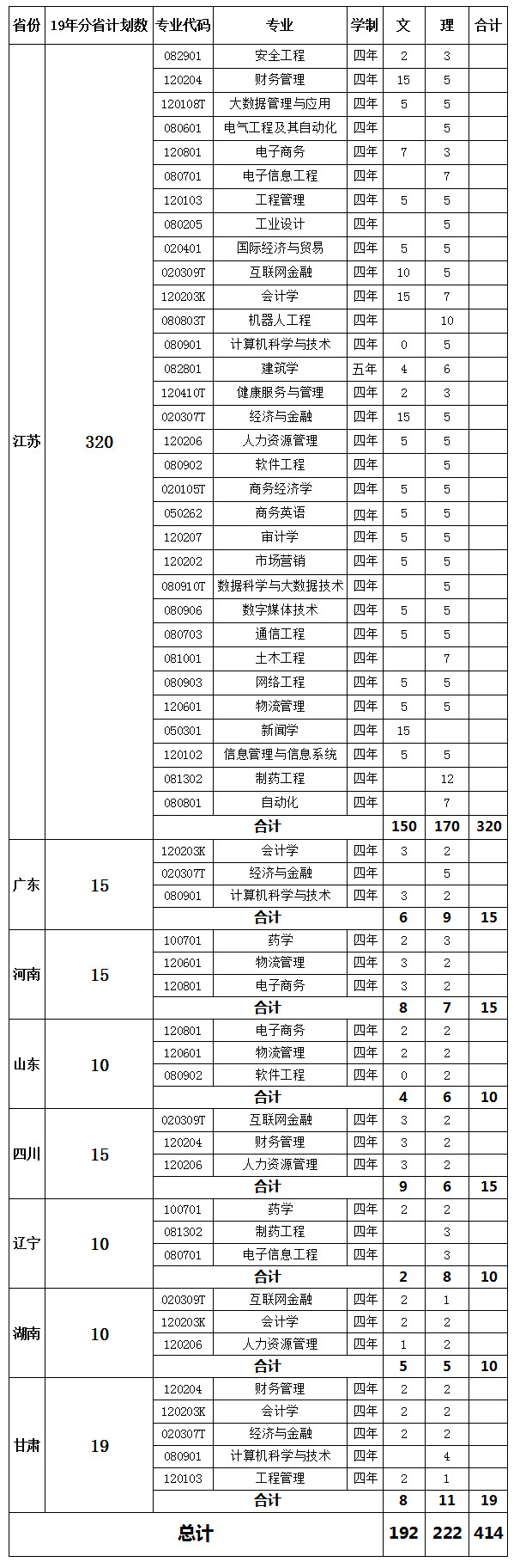 2019年安徽新华学院省外各专业招生计划数(本科)