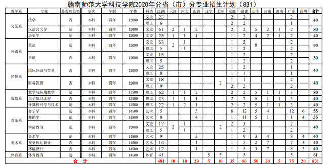 赣南师范大学科技学院2020年分省(市)分专业招生计划