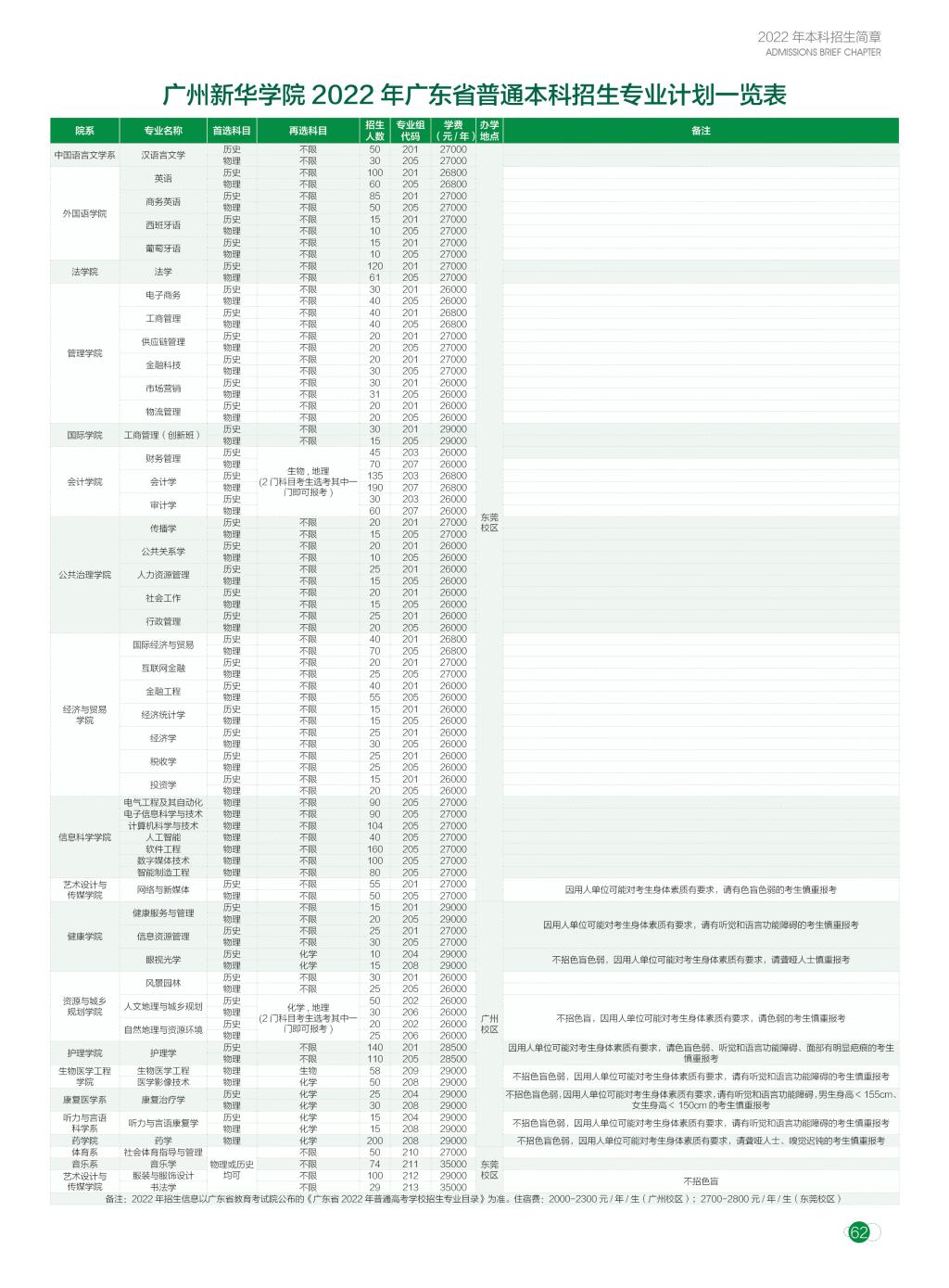 2022年我校共开设52个本科招生专业(含1个创新班),新增招生专业:人工智能、供应链管理。涵盖经济学、法学、教育学、文学、理学、工学、医学、管理学、艺术学9个学科门类。今年我校在广东省共有13个招生专业志愿组,其中历史类4组,物理类5组,音乐类1组,美术类1组,书法类1组,体育类1组。