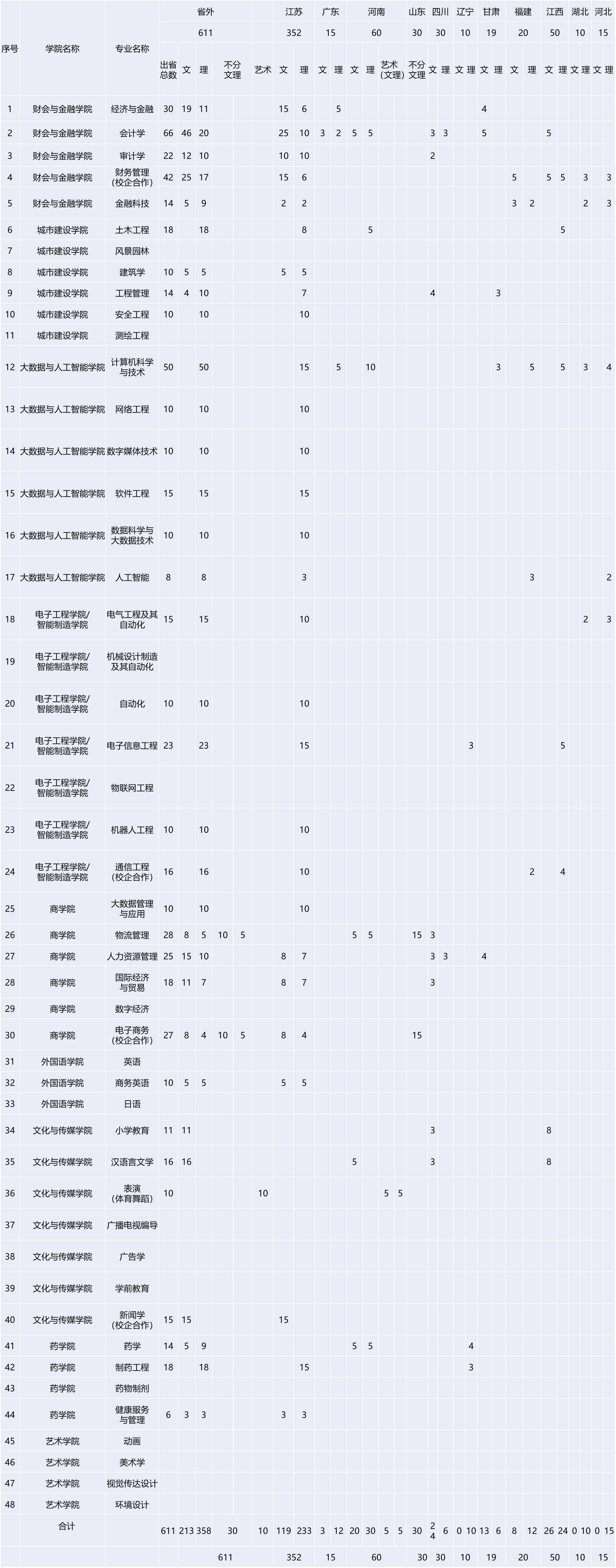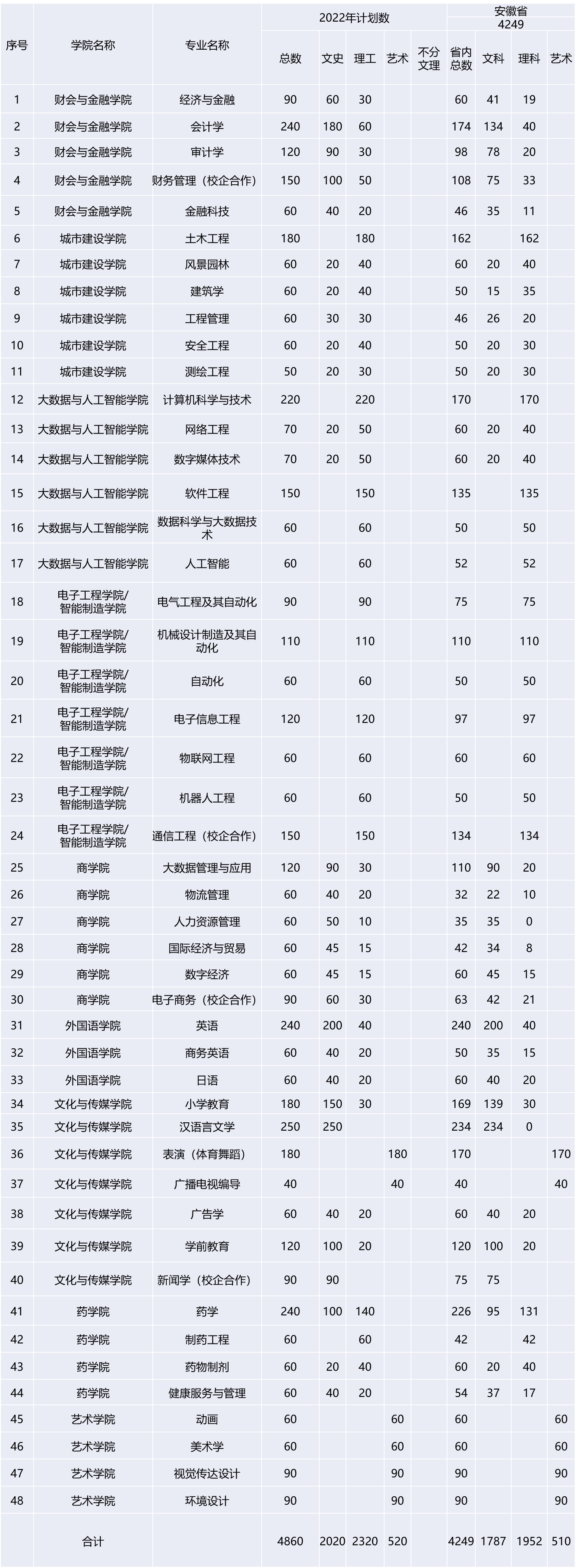 安徽新华学院2022年分省分专业计划