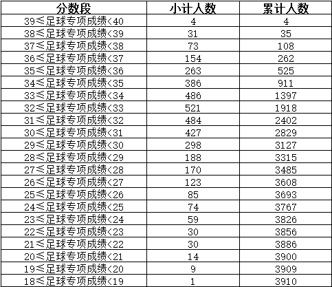 云南省2024年体育专业统考合格考生足球专项成绩分数段统计表