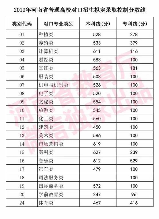2019年河南省普通高校对口招生拟定录取控制分数线