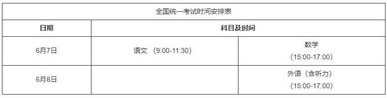 全国统一考试科目由国家统一命题,考试时间安排在6月7日全天和6月8日下午,其中语文考试时长为150分钟,数学、外语考试时长均为120分钟。