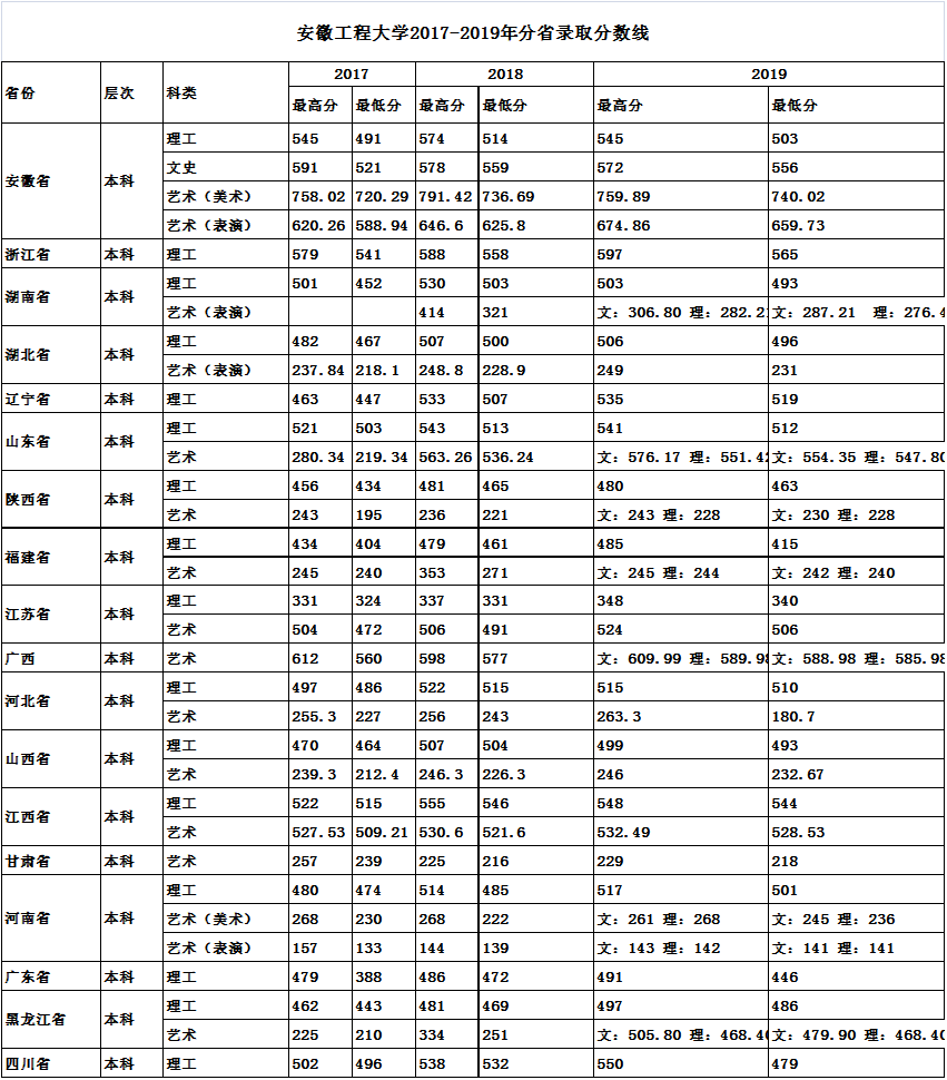 安徽工程大学2017-2019年分省录取分数线