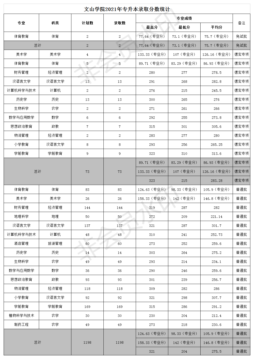 文山学院2021年招生录取分数统计一(云南省专升本)