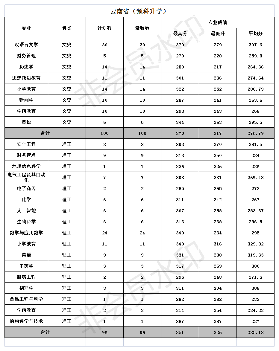 文山学院2021年招生录取分数统计二(云南省预科升学)