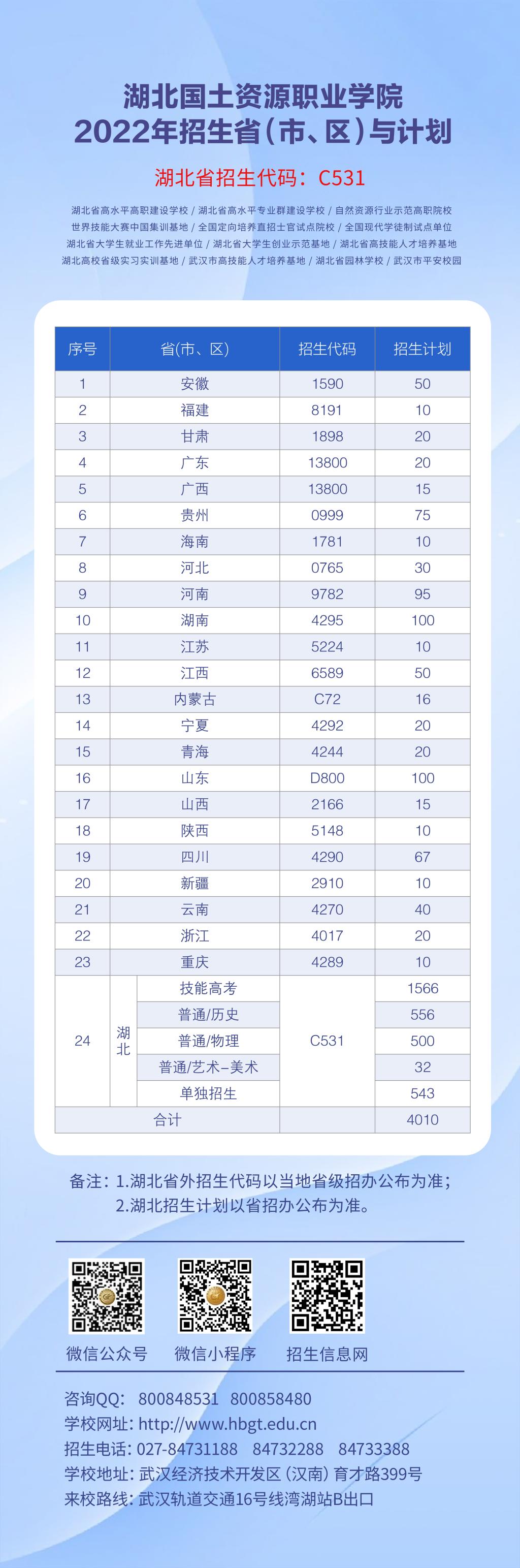 湖北国土资源职业学院2022年面向全国招生省份(区、市)与计划
